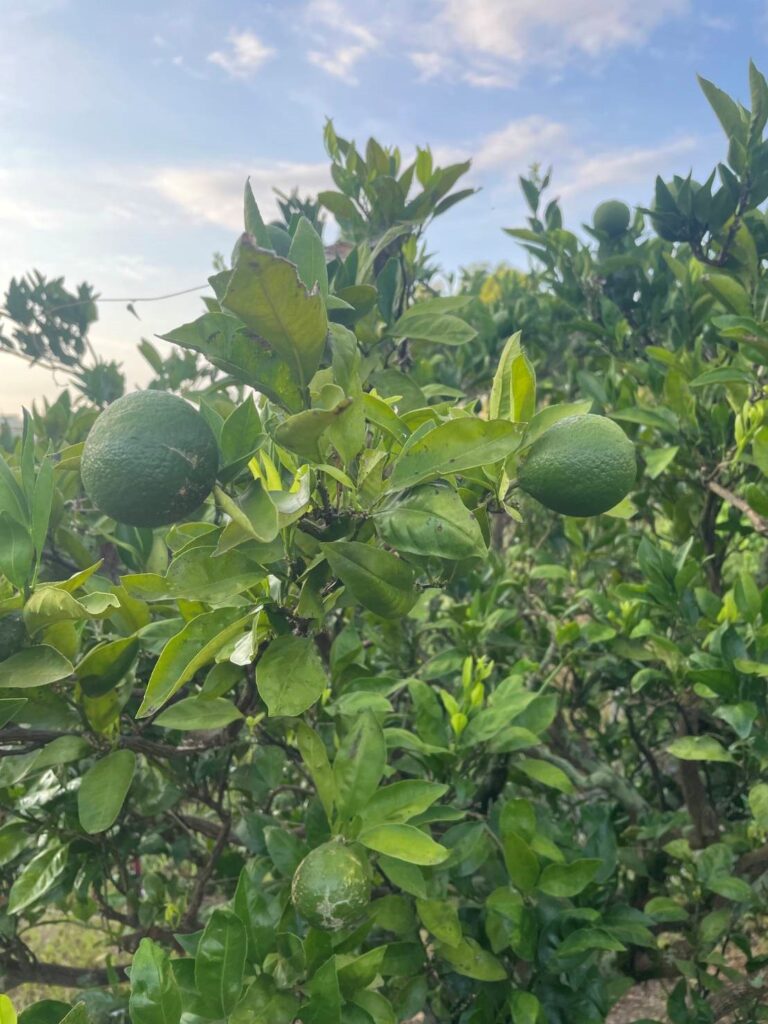 写真のミカンは、会社への行き帰りに通る道すがらにあるものです。形は悪いですが、以前いただいた時は、ものすごく甘かったです。今はまだ緑ですが、これから熟して美味しくなってくると思われます。